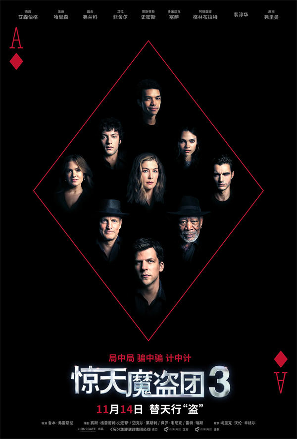 电影《惊天魔盗团3》由美国狮门影片公司出品,中国电影集团公司进口,中国电影产业集团股份有限公司发行,中国电影产业集团股份有限公司译制。影片将于11月14日在中国内地上映,目前正在火热预售中。
